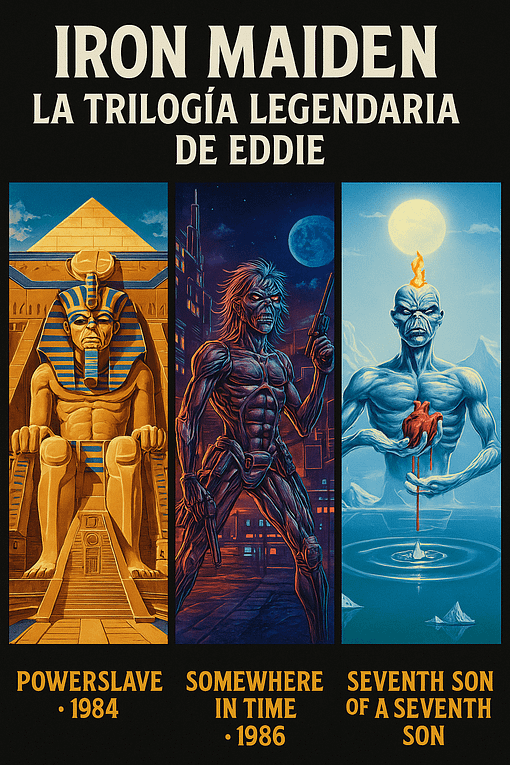 La cosa se puso seria. Maiden se metió en lo épico, lo histórico y lo sci-fi. Eddie dejó la calle para convertirse en faraón, cyborg y profeta helado. 🎵 Álbumes clave: Powerslave (1984), Somewhere in Time (1986), Seventh Son of a Seventh Son (1988). 🖼️ Portadas: Eddie como faraón egipcio, viajero del tiempo y figura mística entre glaciares.